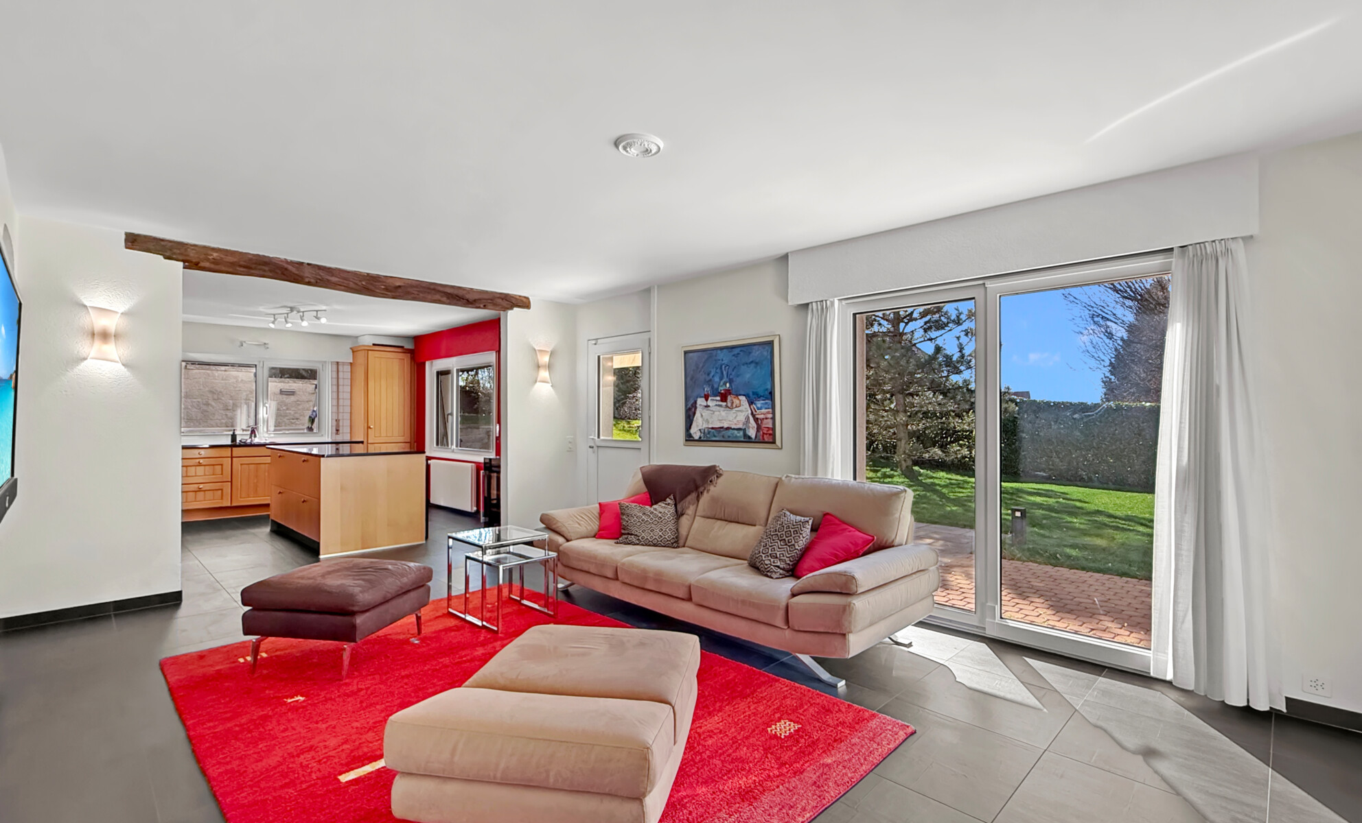 Un hall d’entrée dessert un séjour et une salle à manger, séparés par une cheminée, ainsi qu’une vaste cuisine équipée avec îlot central et une salle de douche avec WC. Le séjour s’ouvre sur une terrasse partiellement couverte d’env. 43 m² et sur un vaste jardin paysagé, entièrement à l’abri des regards.
